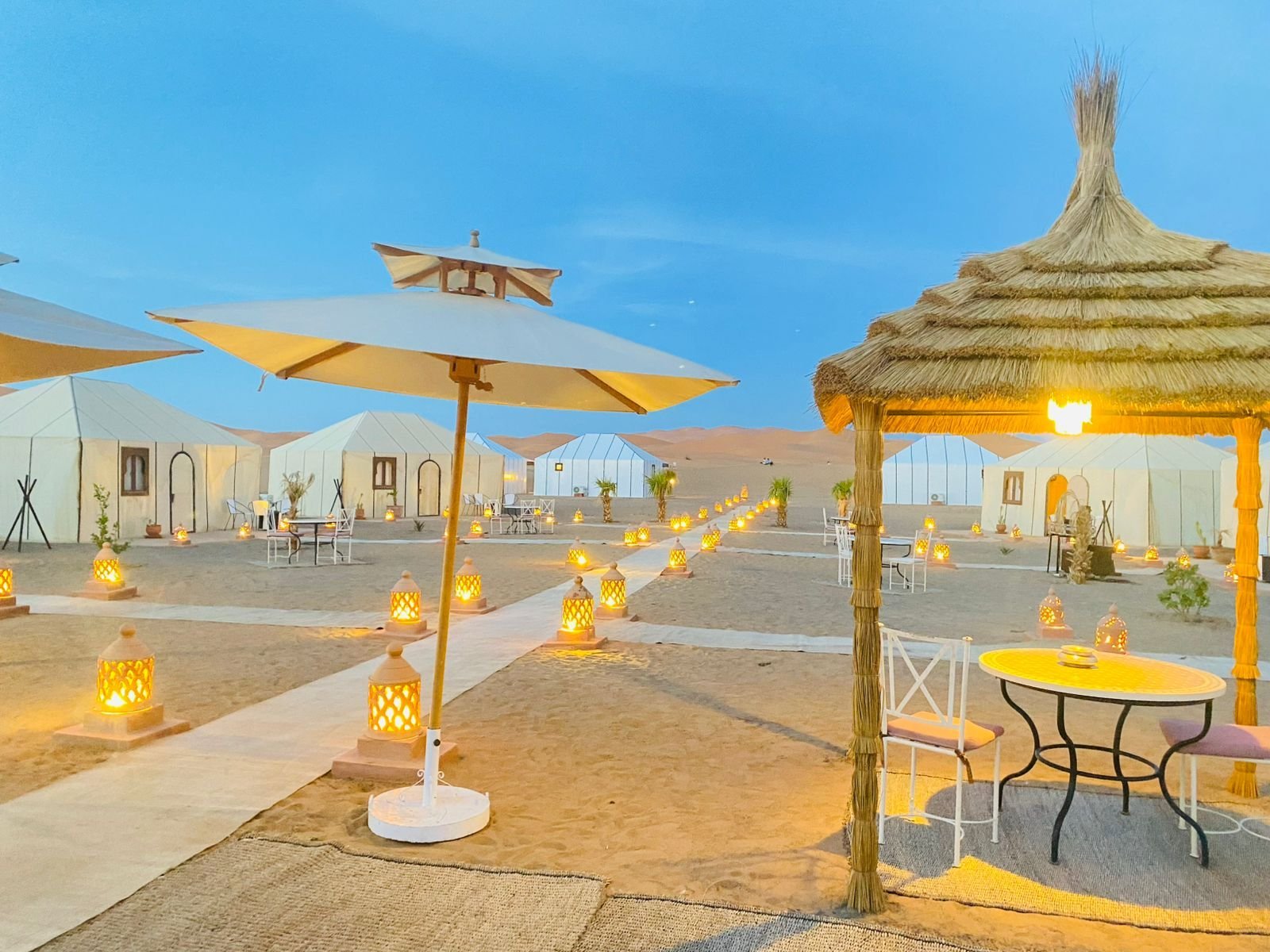 Yes — the camel trek to the luxury desert camp and the overnight stay (including dinner and breakfast) are fully included in the standard tour price. The camel trek is the one-way ride into the camp at sunset, lasting approximately 1 to 1.5 hours across the dunes. The return from camp the following morning is by 4x4 vehicle, allowing time for the sunrise dune walk before departure. The desert camp provides private furnished tents with proper beds, linen, electricity, and en-suite toilet facilities. This is not a basic Bedouin bivouac — it is a comfortable, atmospheric camp that combines genuine desert immersion with the practical comfort that multi-week travelers appreciate after ten days on the road.